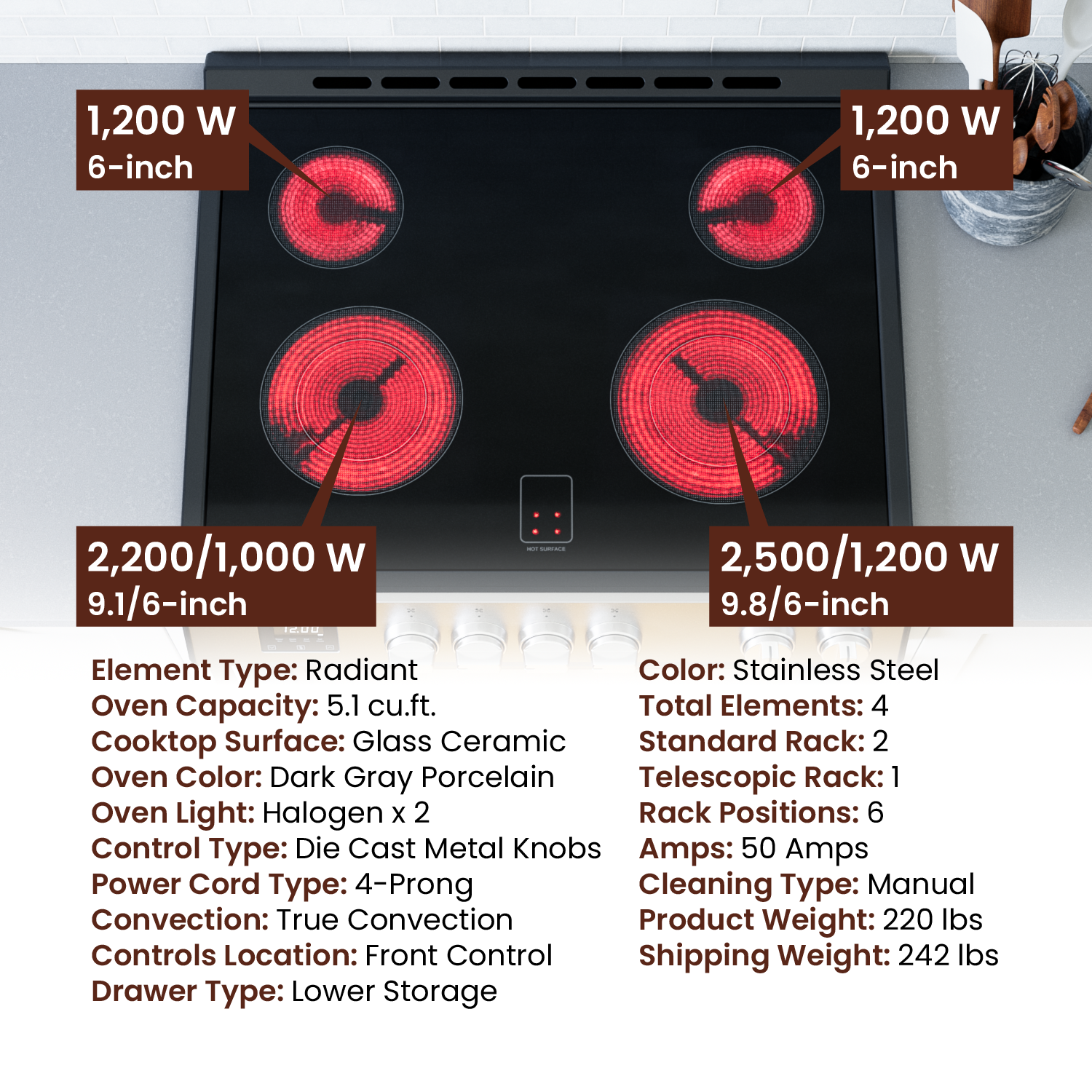 Nuestras cocinas eléctricas cuentan con una superficie de vidrio cerámico suave y fácil de limpiar, lo que le permite pasar menos tiempo limpiando y más tiempo cocinando comidas deliciosas.
