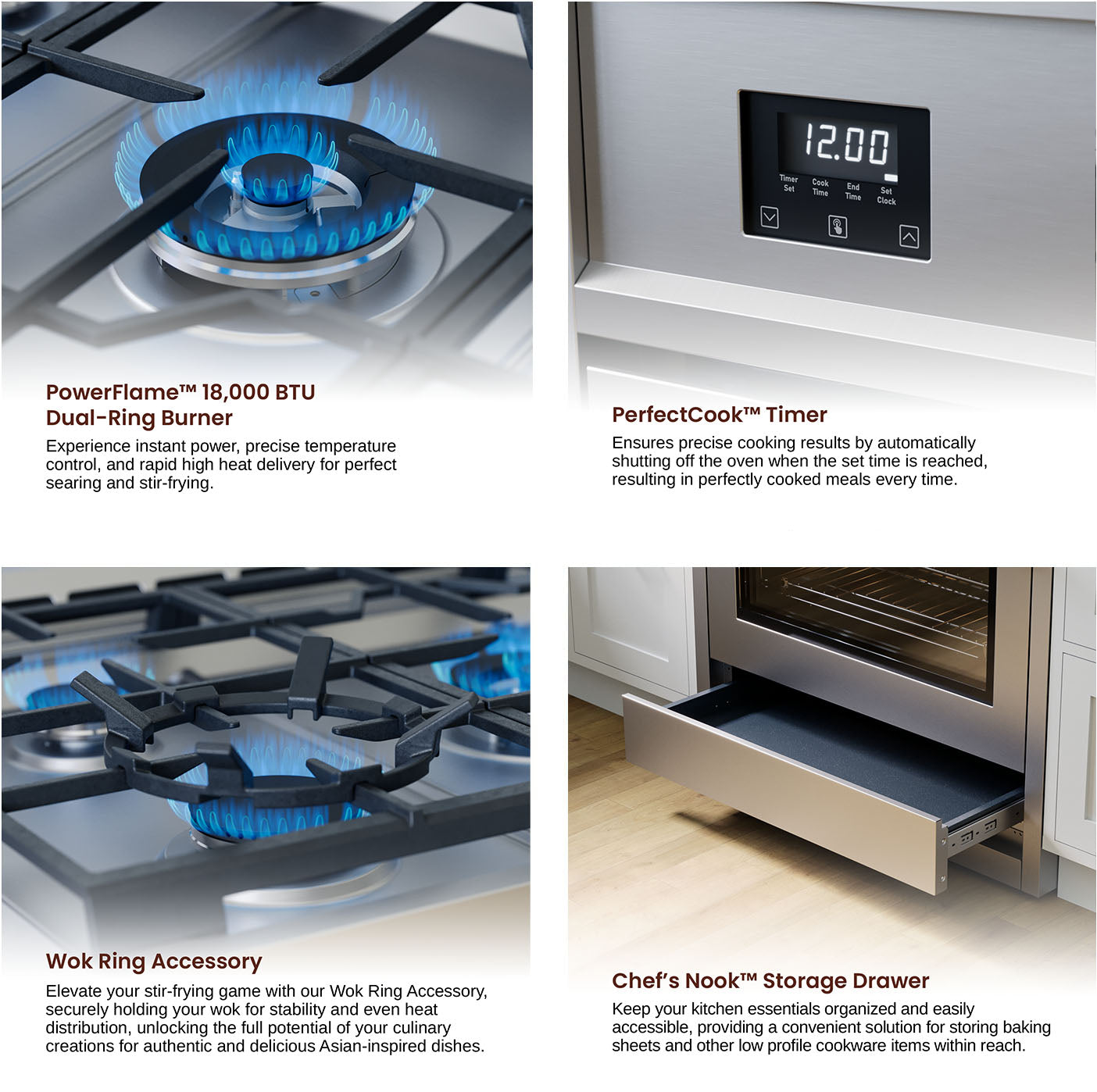 Quemador de doble anillo PowerFlame™: experimente potencia instantánea, control preciso de temperatura y entrega rápida de calor alto para sellar y saltear a la perfección.